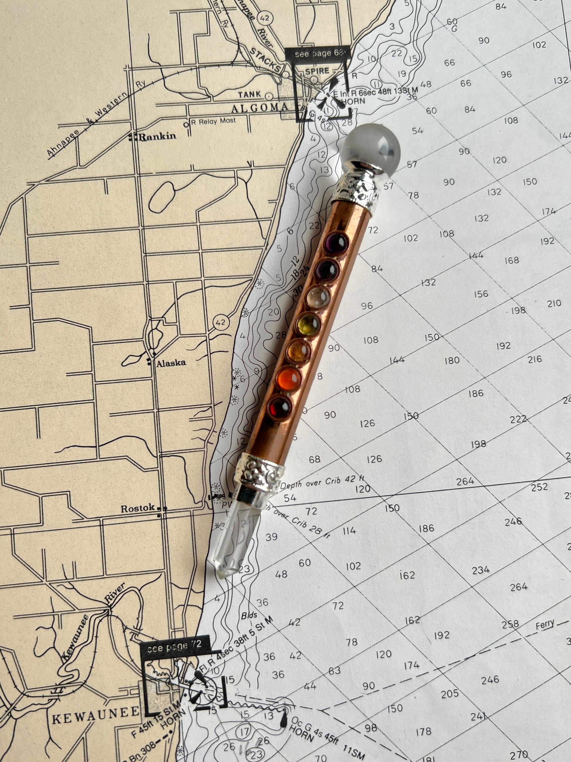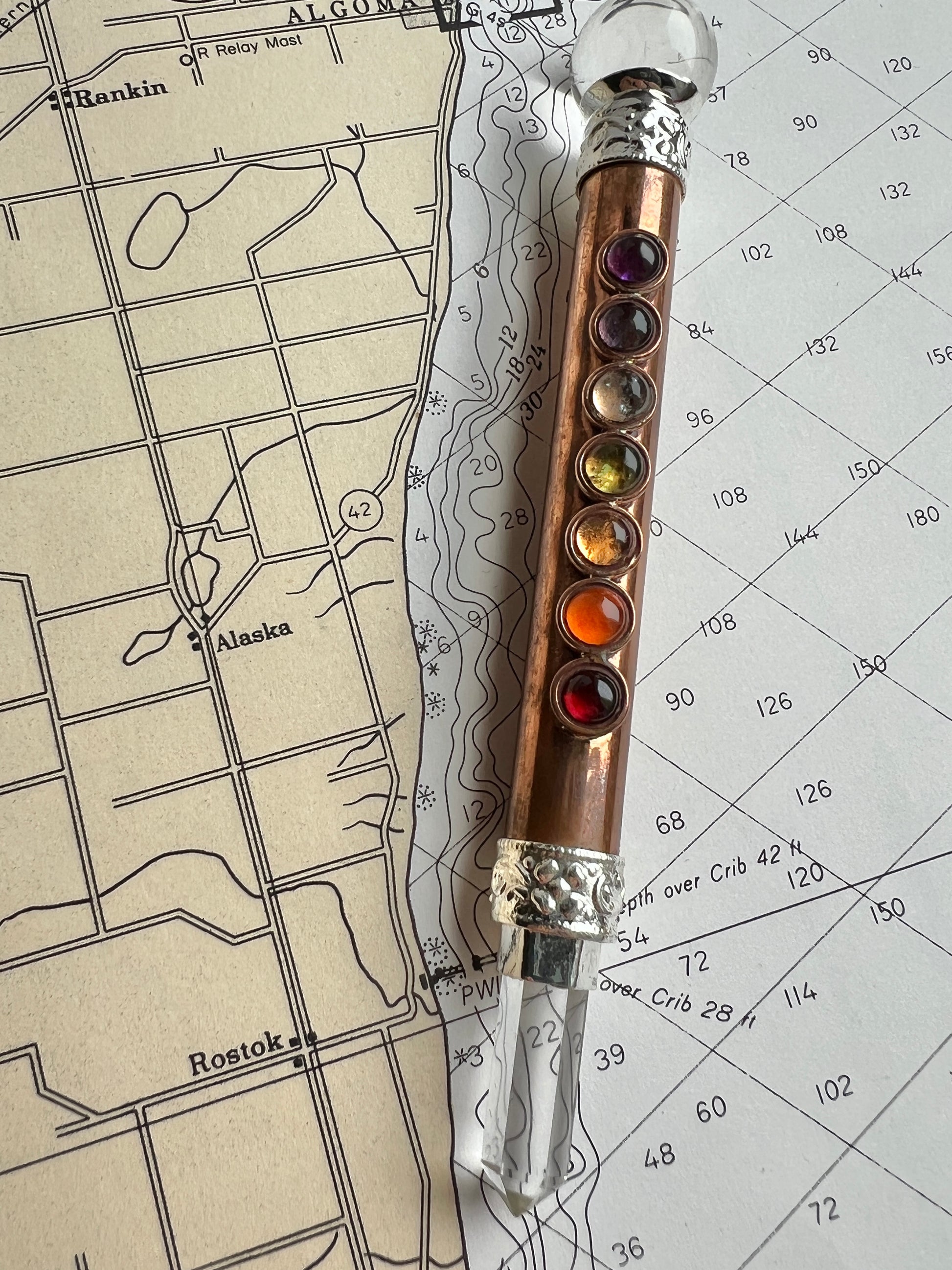 This healing wand is approximately 4 1/2", it features a copper conductor and seven colored stones corresponding to each of the Chakras to assist with physical and spiritual healing. The ends of the wand have natural Quartz crystals. One end is a sphere and the other end is a point. These healing wands help gather and direct energy while working on aligning your chakras. They are also great for a meditation tool as well.