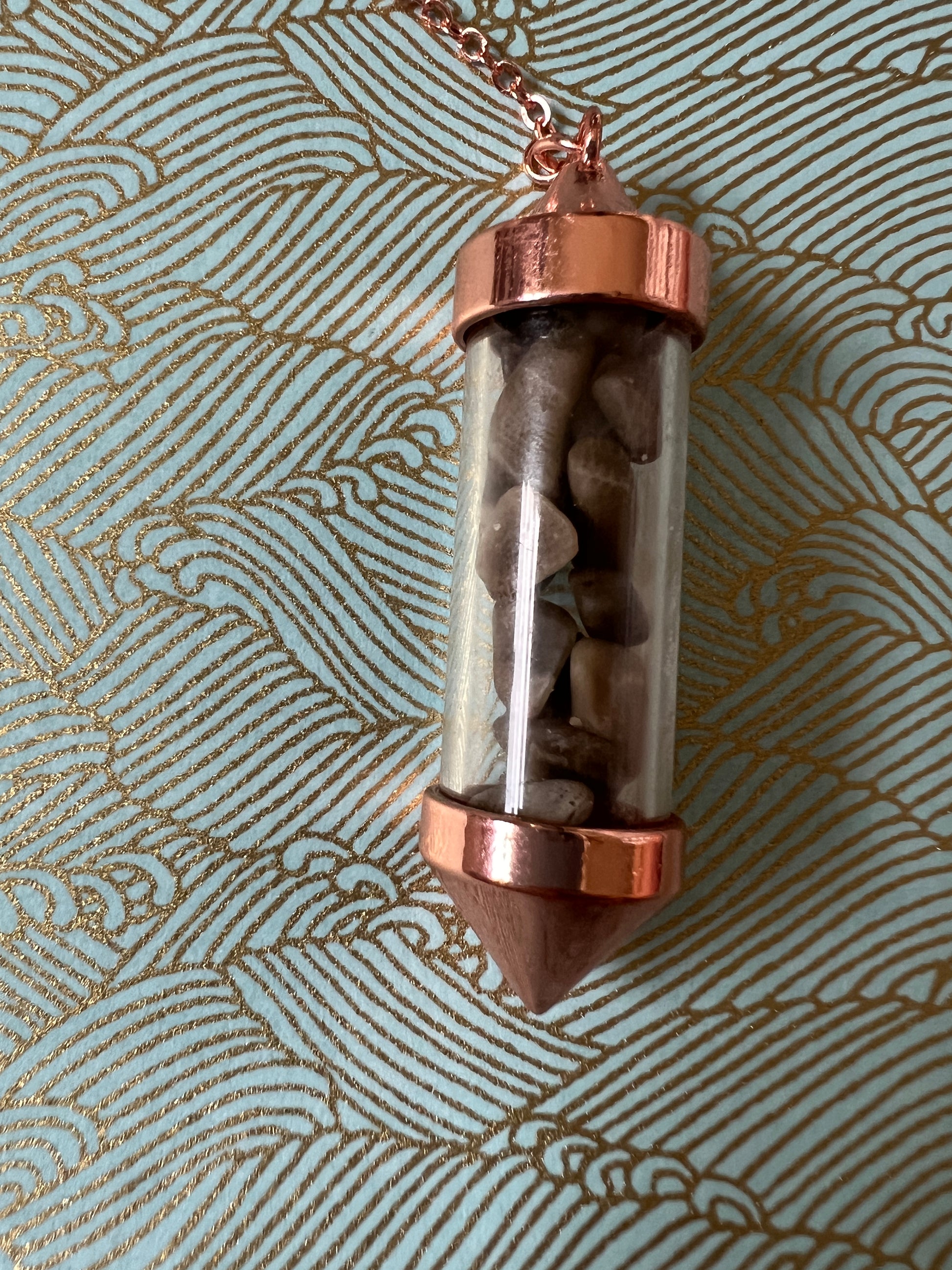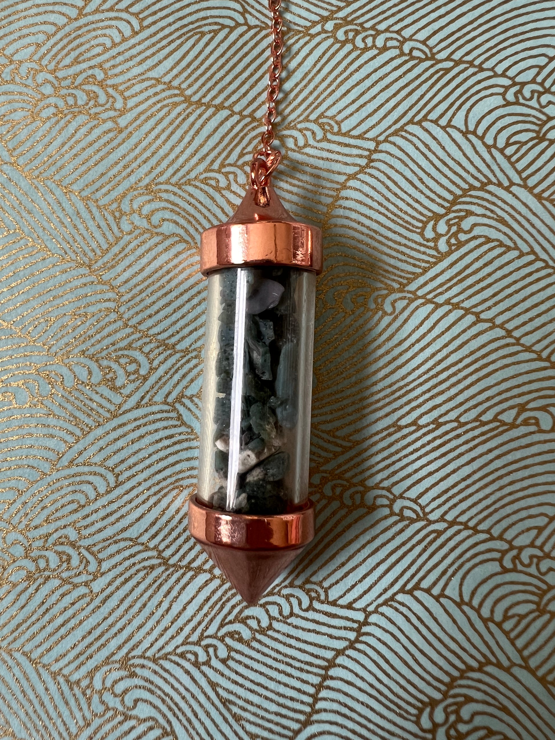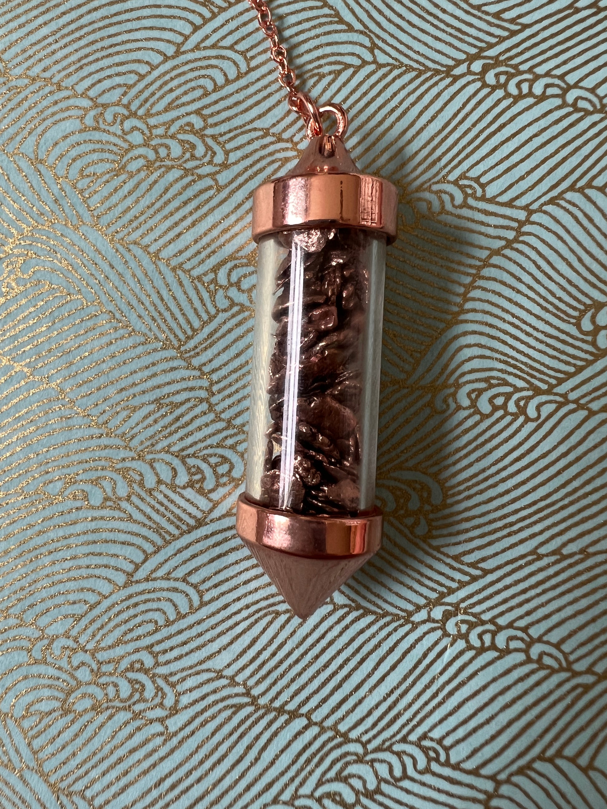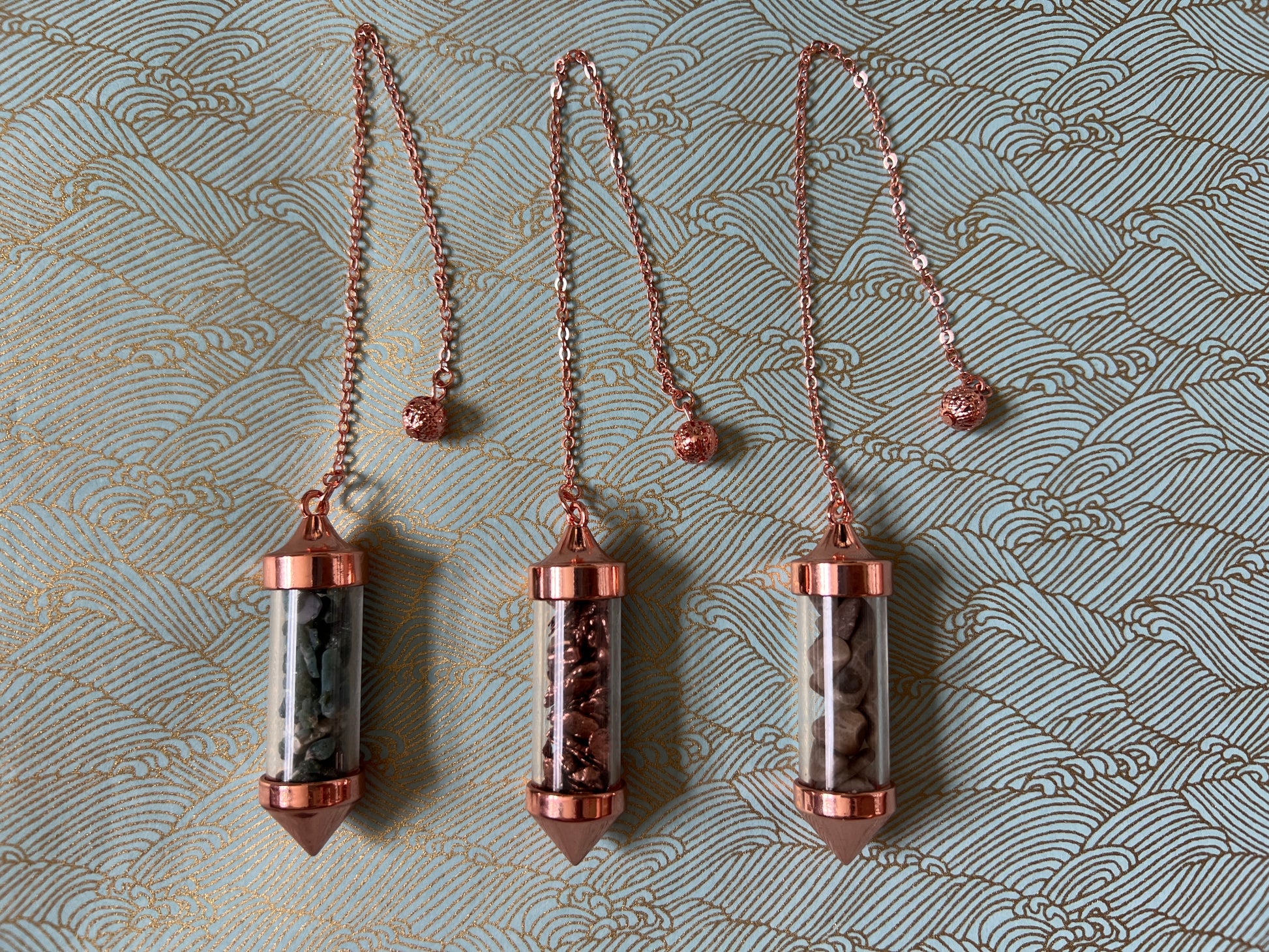These brass copper plated pendulums have a removable magnetic cap that allows them to be refillable with any tiny lake treasure! I only have a limited number of these available! Each are approximately 2” tall. They are a heavier weight at approximately 1 oz.