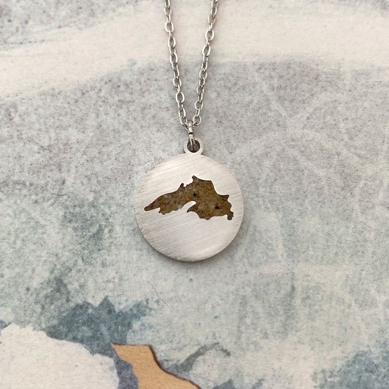 This dainty necklace has sand from Lake Superior sealed right into the cutout of the lake! Remember your days at the lake with this necklace around your neck. The pendant on the necklace is .5 inch and comes on a closed link chain that is adjustable from 17” to 19.5” with a lobster clasp closure
