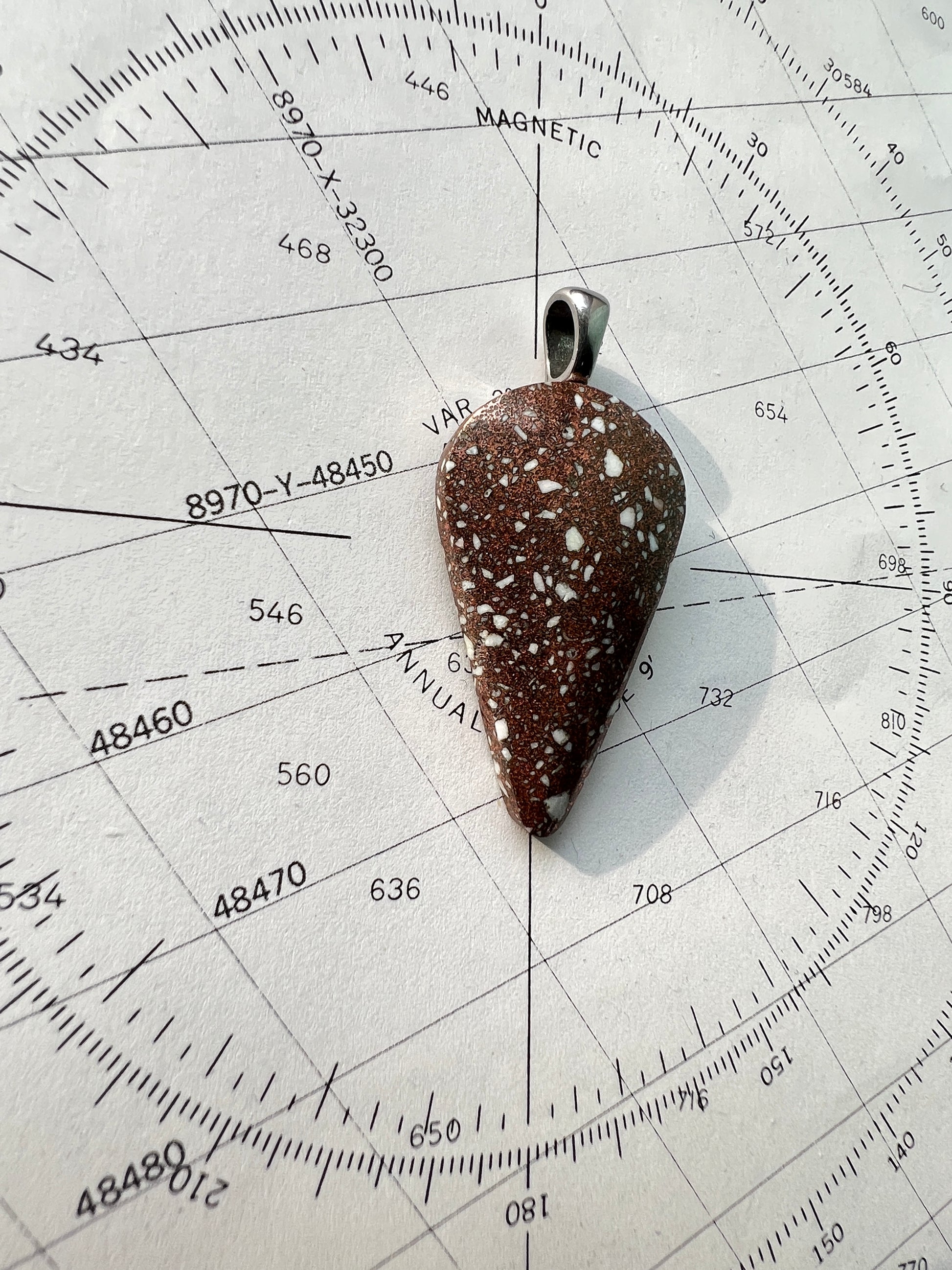 Michigan Firebrick stones are a by product of the old firebrick lining of the copper smelter smokestacks from the late 1800’s and early 1900’s. During copper processing the copper would stick to the fire brick walls of the smelter. This necklace features a teardrop shaped stone mounted on a stainless steel bail and an adjustable stainless steel chain (17-19.5”) with a lobster claw closure. The necklace will come in a gold colored gift box.
