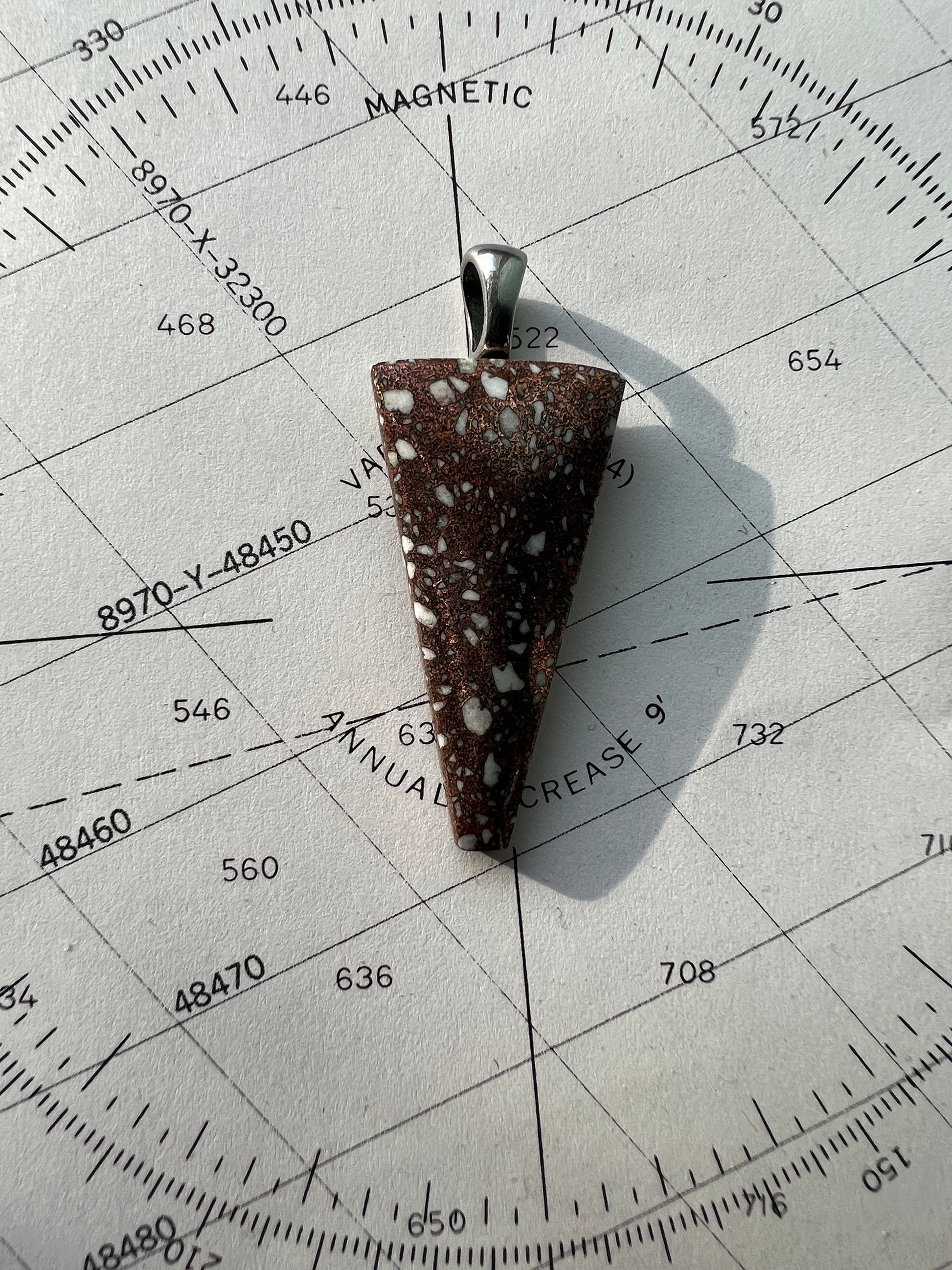 - Rectangle shaped stone contains copper that may patina over time and tiny specks of firebrick from the smelter.