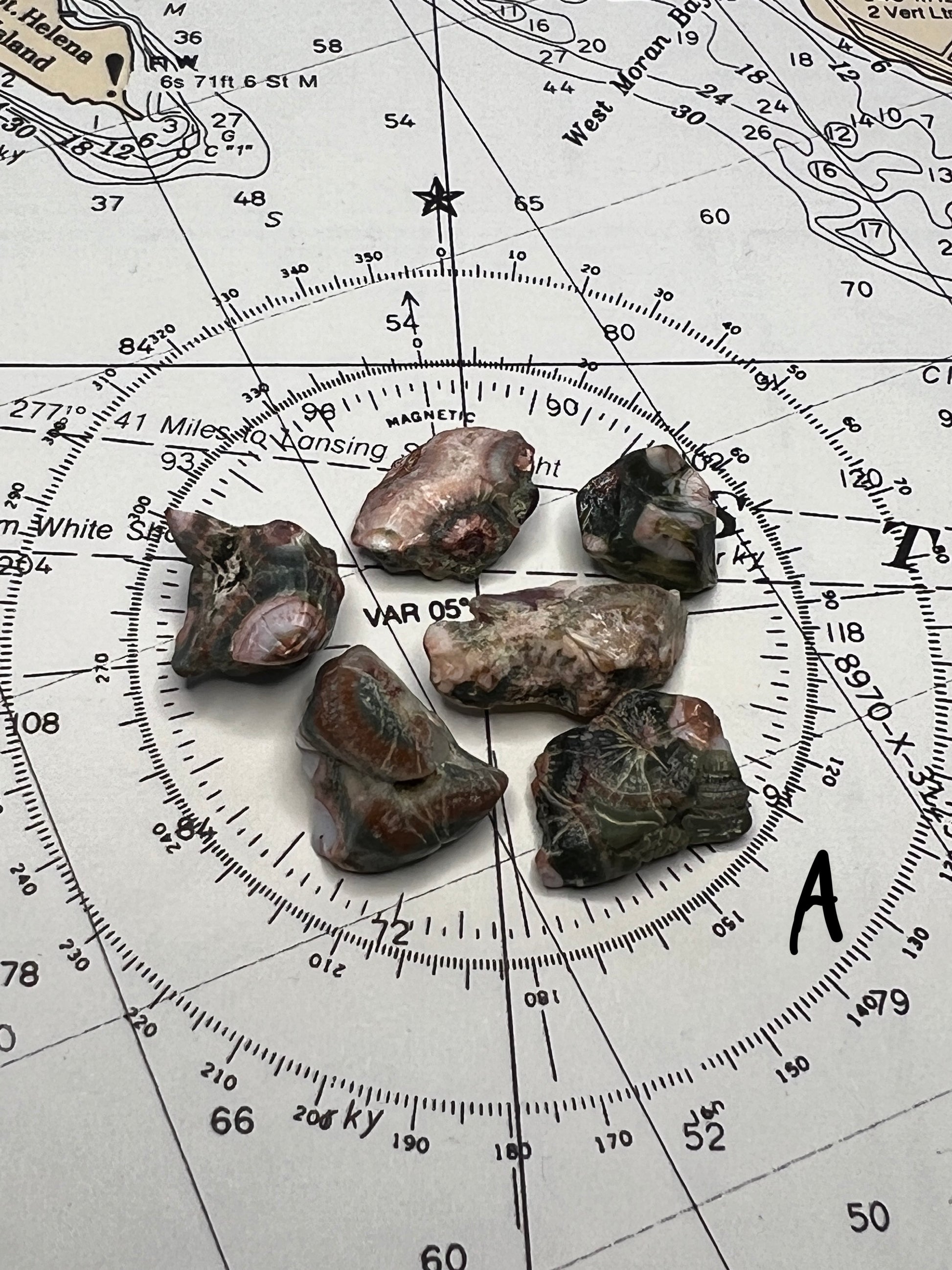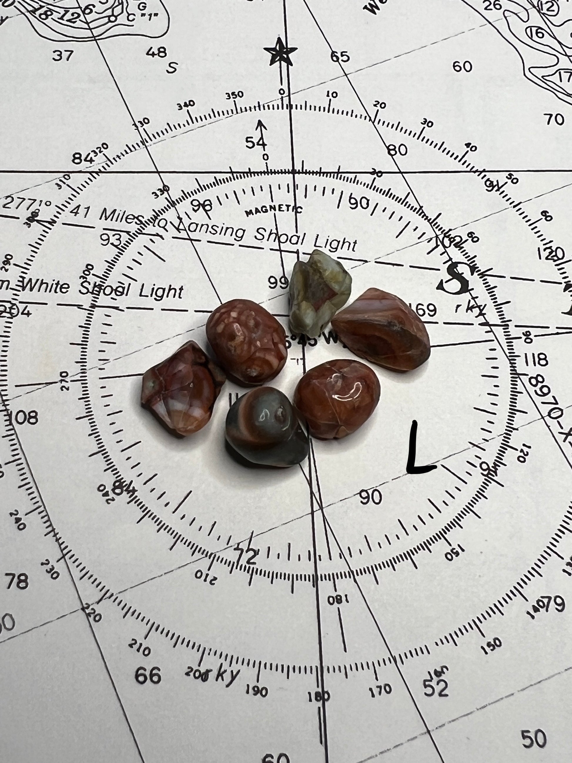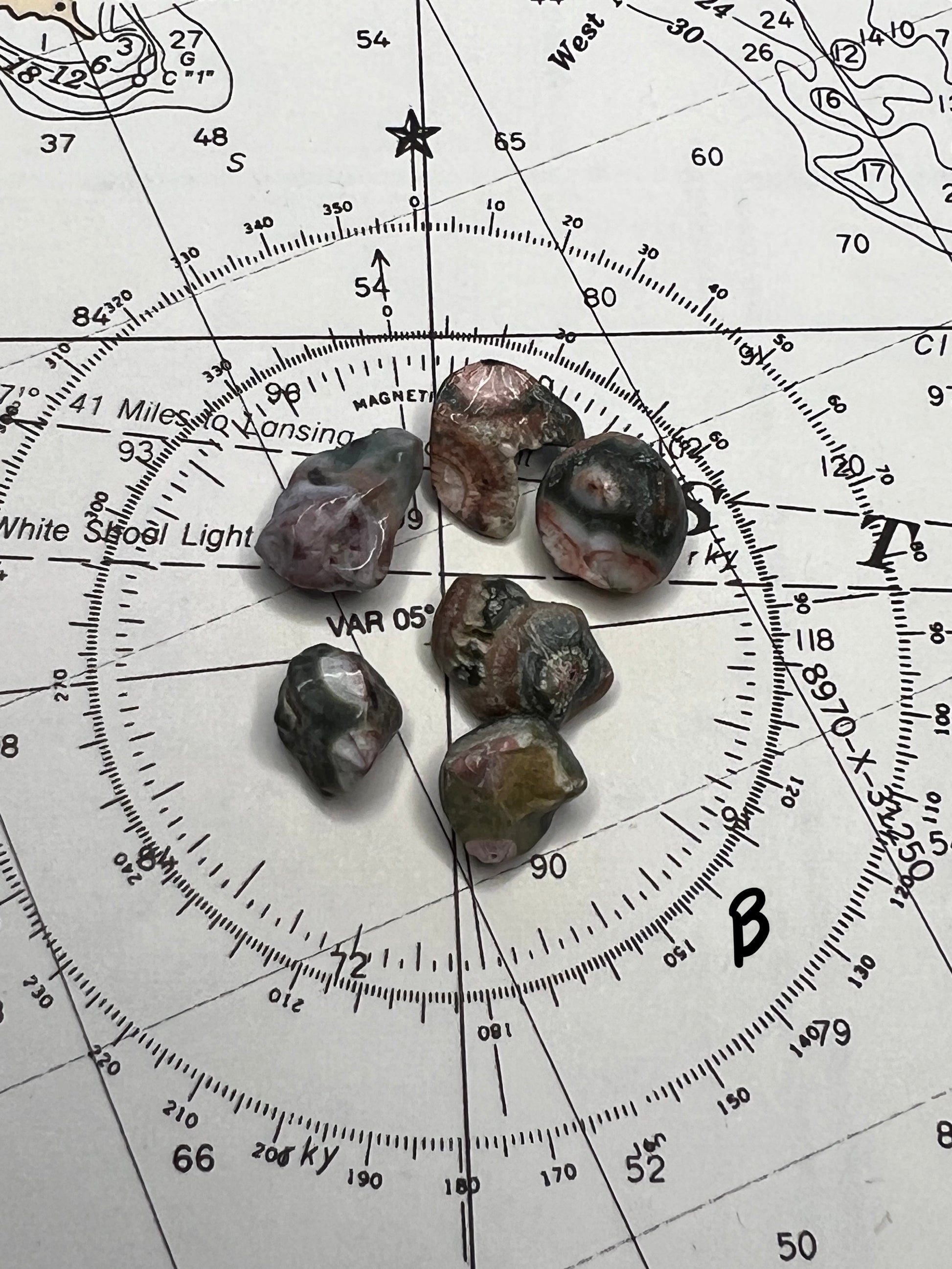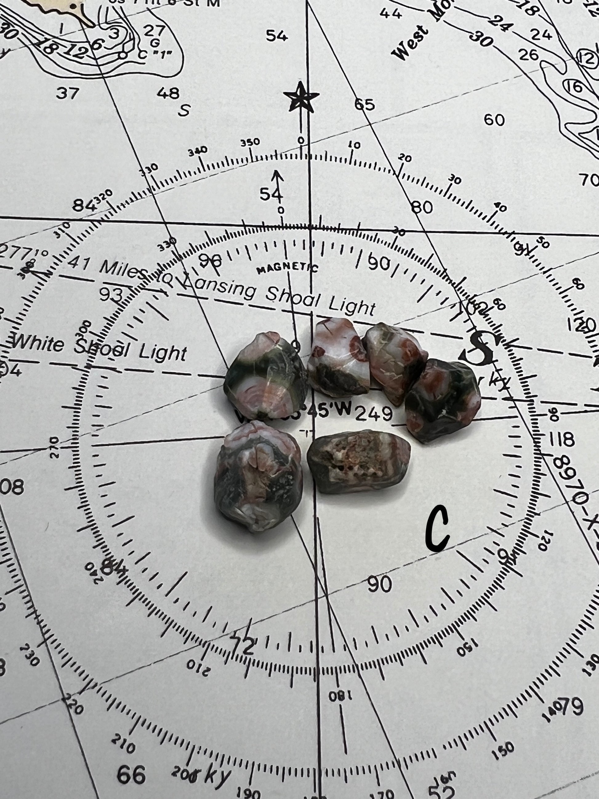 These little gems are formed in a similar to process to agates. They start out as trapped air pockets within volcanic basalt and fill with prehnite and minuscule pieces of copper. It is only found along the north shore of Lake Superior. They feature pinks and green colors and are some of the prettiest stones out of the Great Lakes. Specify letter when ordering.