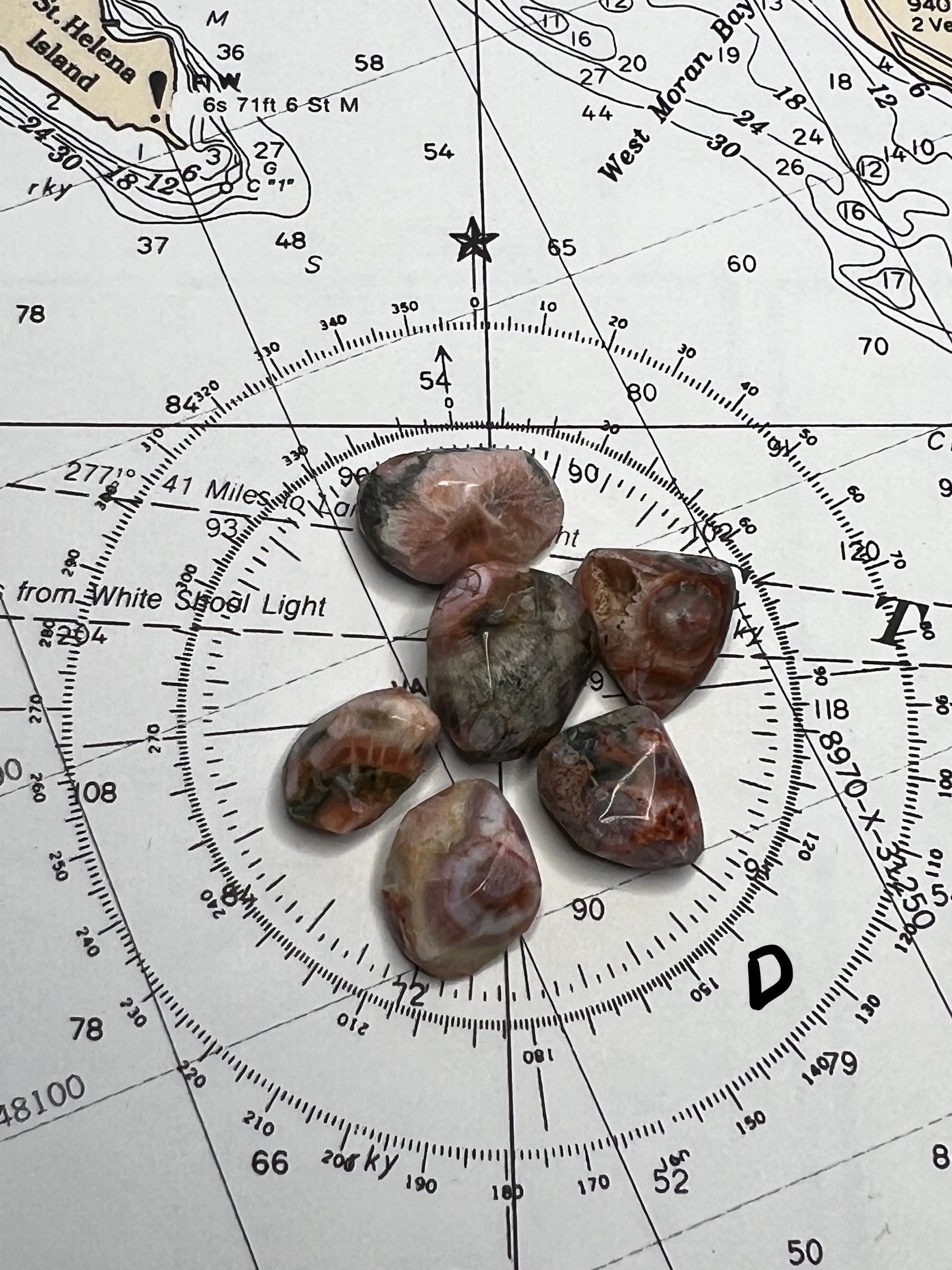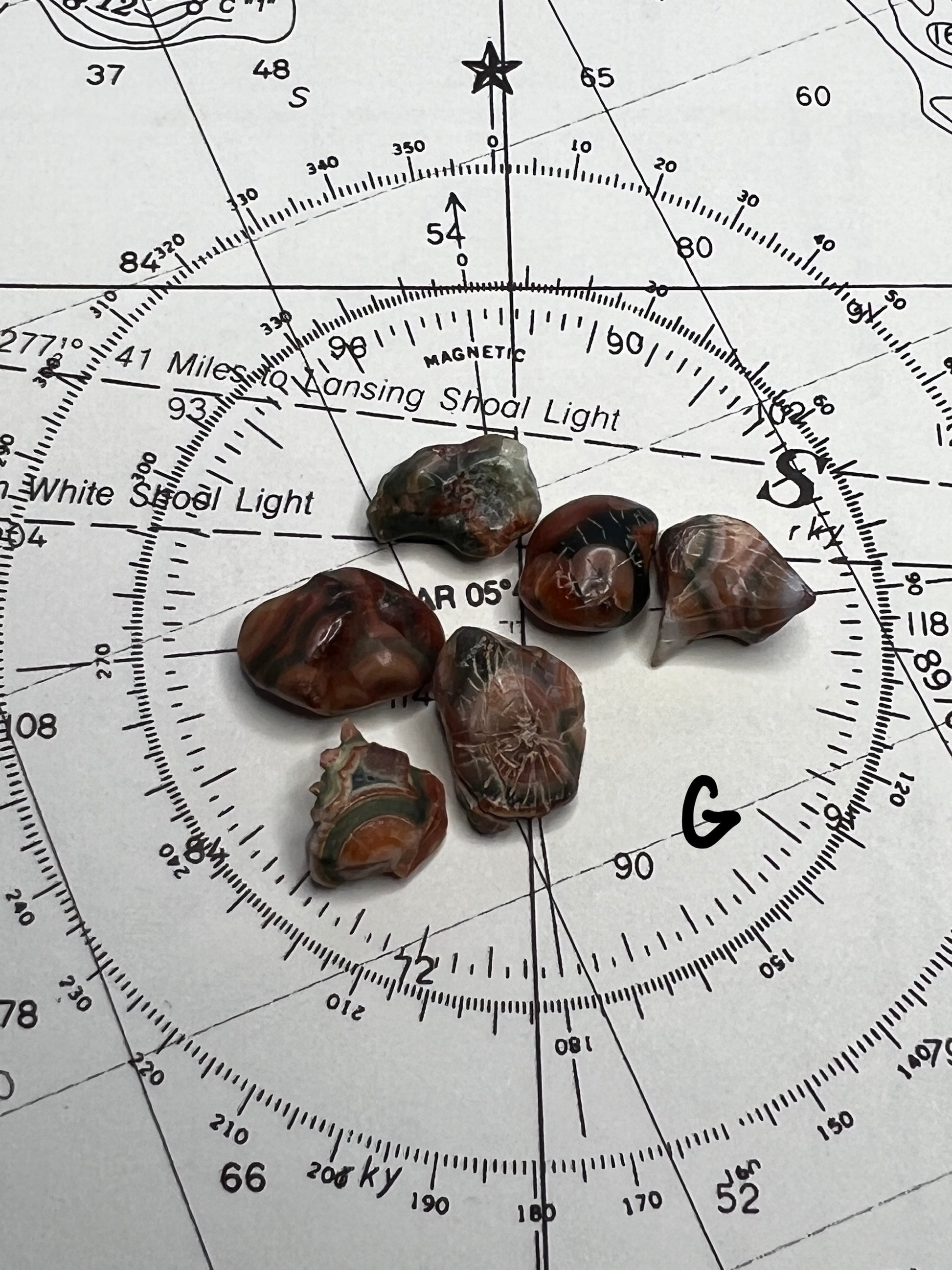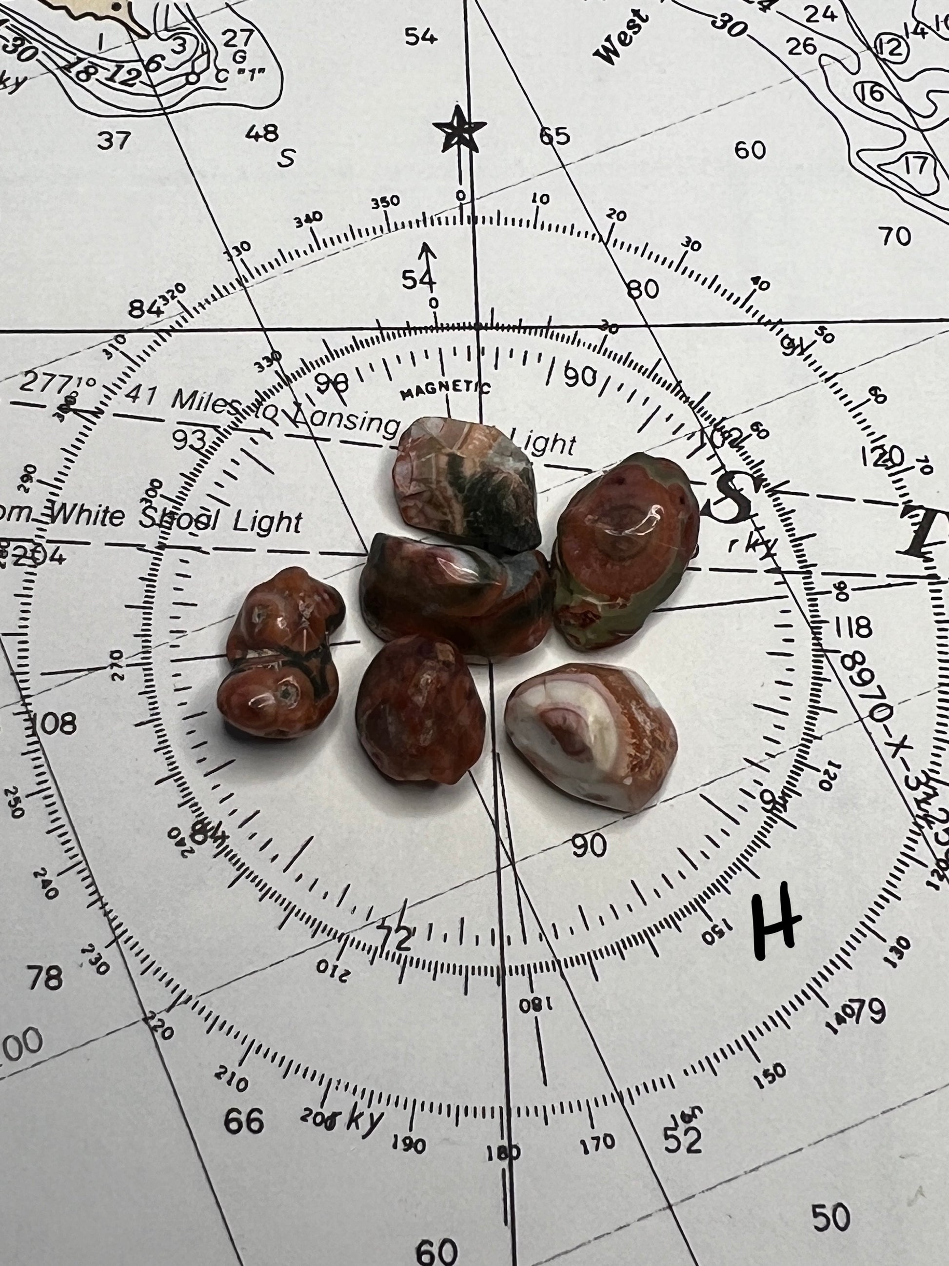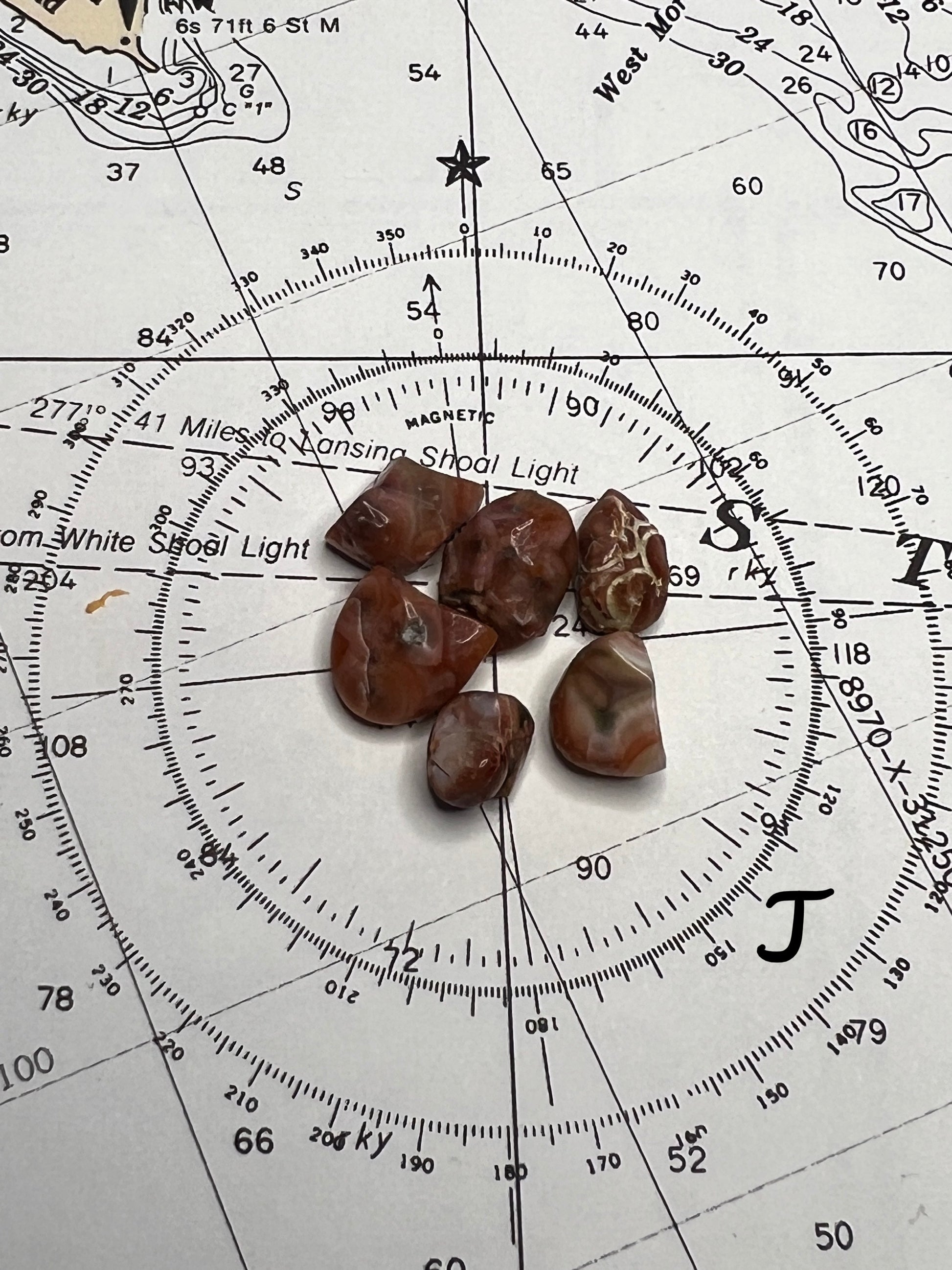 These little gems are formed in a similar to process to agates. They start out as trapped air pockets within volcanic basalt and fill with prehnite and minuscule pieces of copper. It is only found along the north shore of Lake Superior. They feature pinks and green colors and are some of the prettiest stones out of the Great Lakes. Specify letter when ordering.