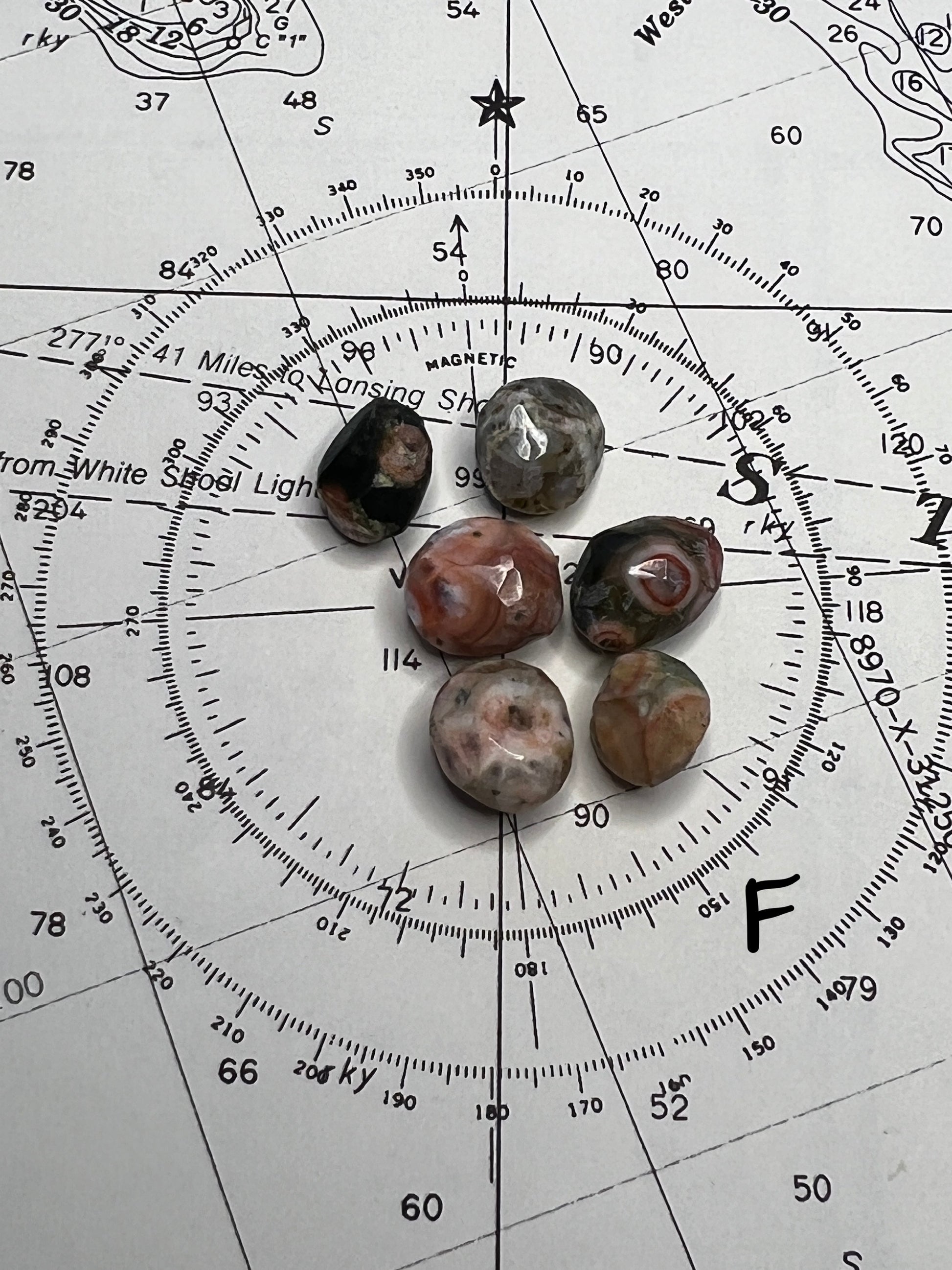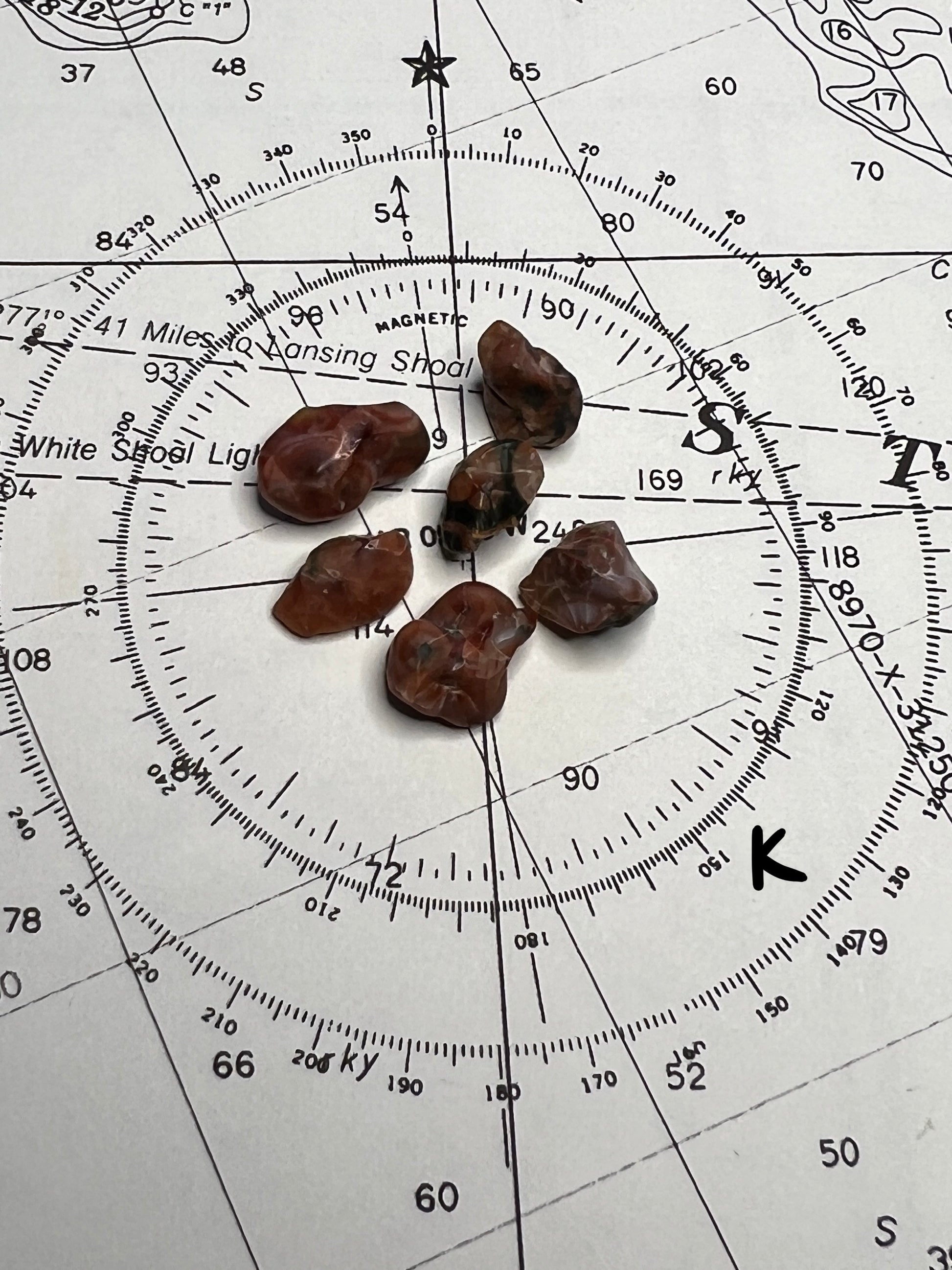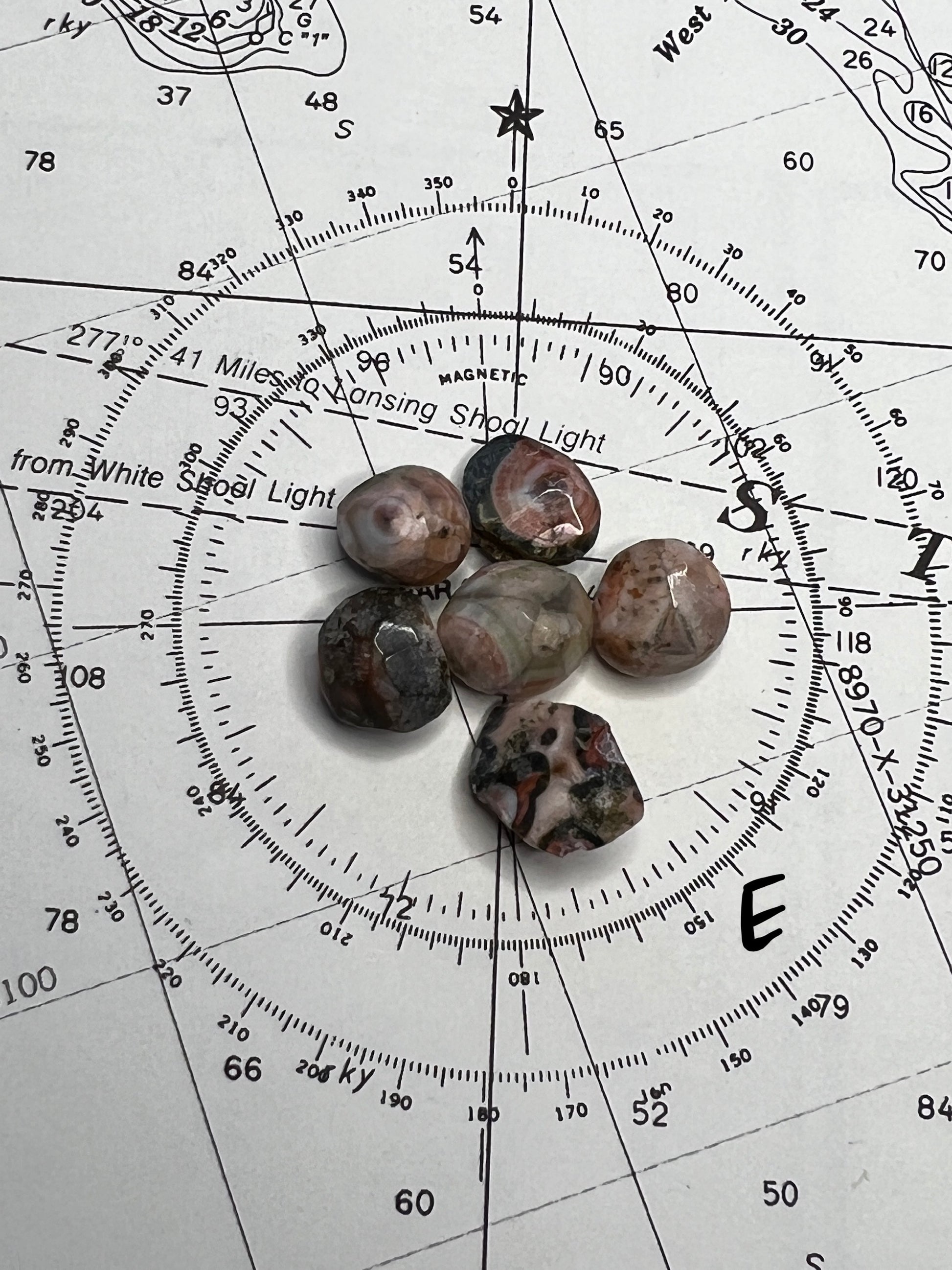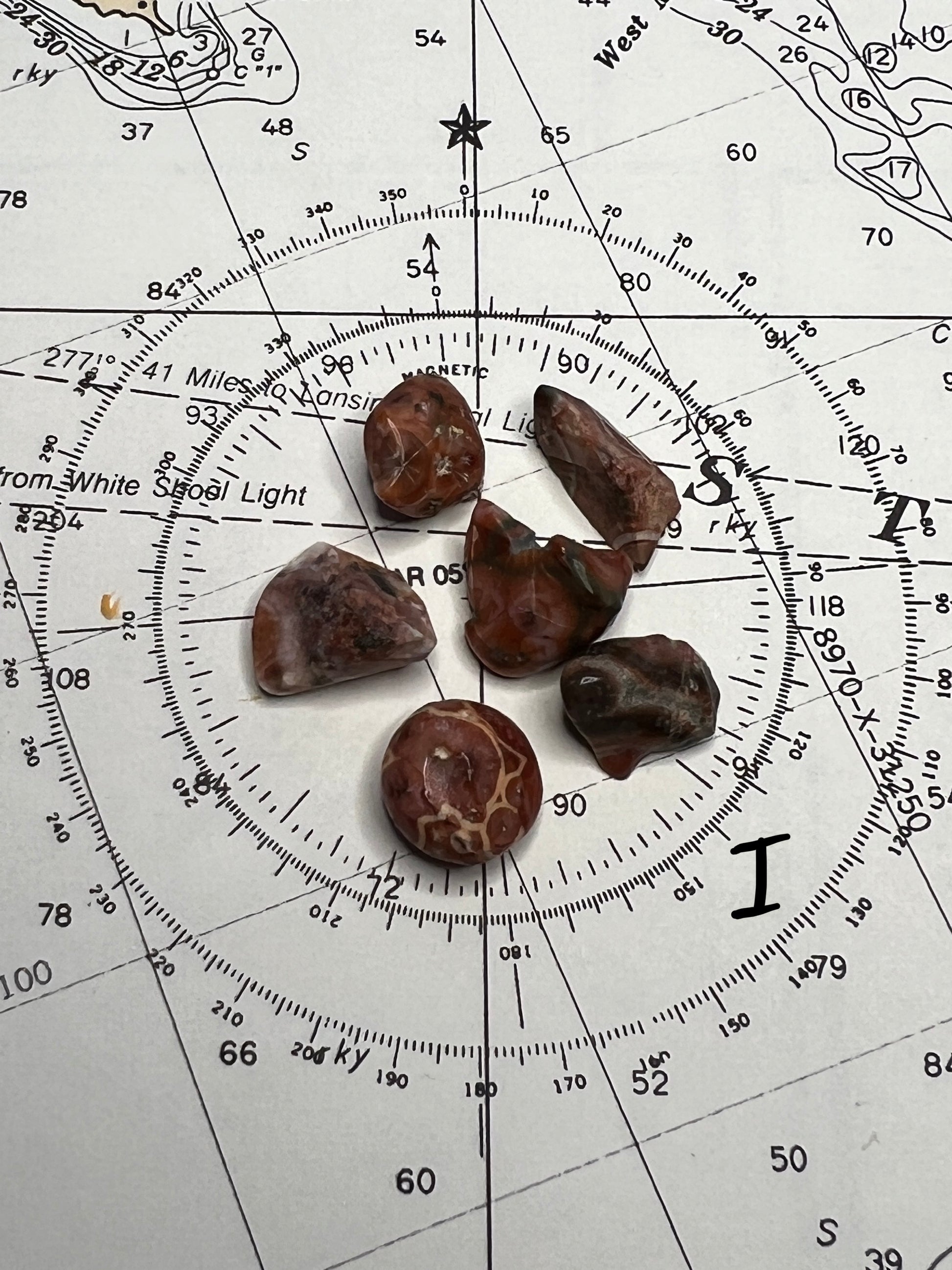 These little gems are formed in a similar to process to agates. They start out as trapped air pockets within volcanic basalt and fill with prehnite and minuscule pieces of copper. It is only found along the north shore of Lake Superior. They feature pinks and green colors and are some of the prettiest stones out of the Great Lakes. Specify letter when ordering.